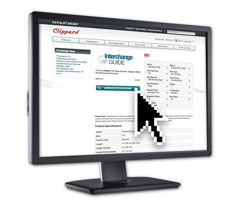 Looking to replace a cylinder from another manufacturer? The Clippard.com website makes it easy with a built-in cylinder Interchange Guide. Just enter your cylinder part number into any search box and the Interchange Guide will identify which Clippard cylinders are most similar, complete with a full comparison.